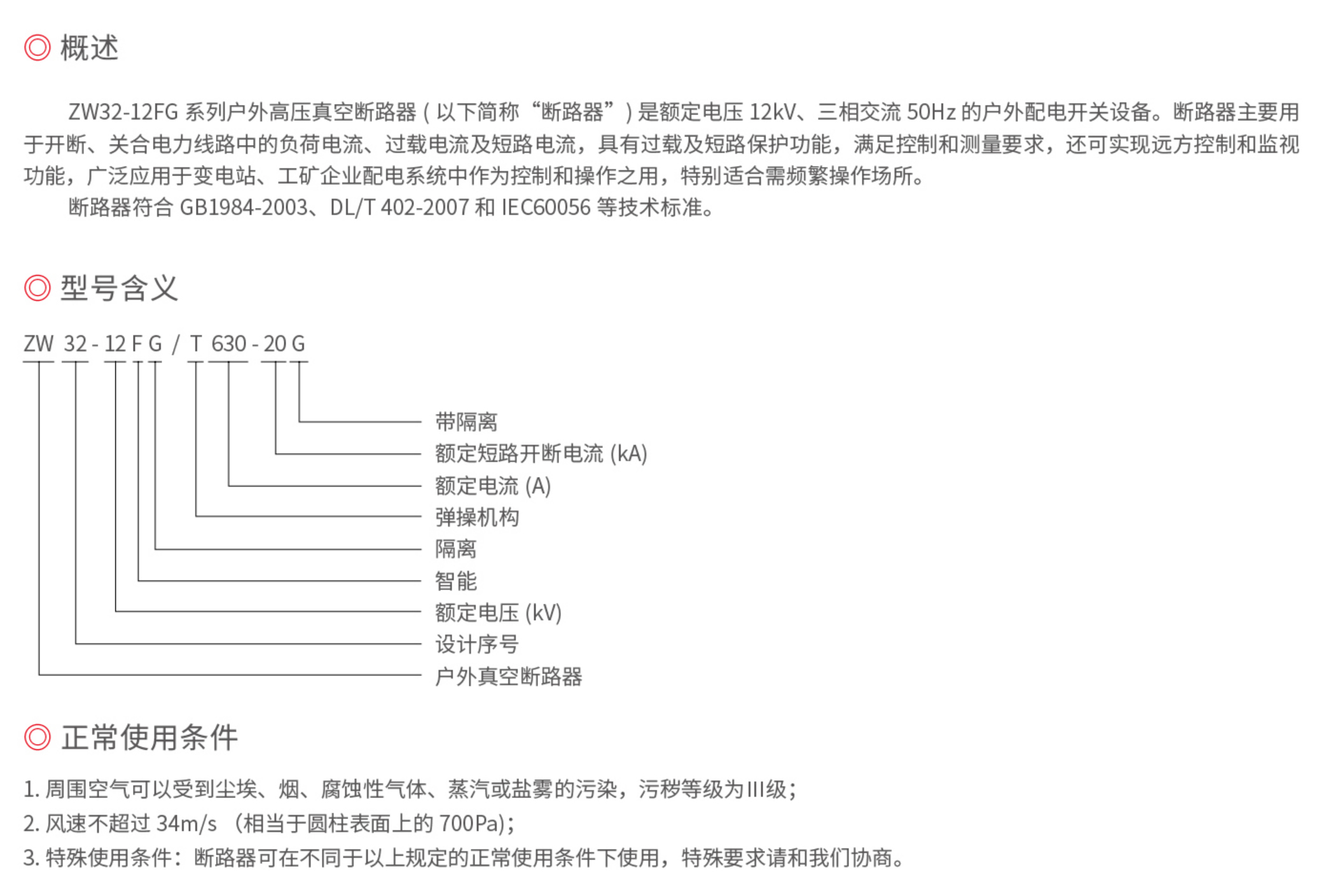 ZW32-12FG系列戶外高壓真空斷路器(以下簡(jiǎn)稱(chēng)“斷路器”)是額定電壓12kW、三相交流50Hz的戶外配電開(kāi)關(guān)設(shè)備。斷路器主要用于開(kāi)斷、關(guān)合電力線路中的負(fù)荷電流、過(guò)載電流及短路電流,具有過(guò)載及短路保護(hù)功能,滿足控制和測(cè)量要求,還可實(shí)現(xiàn)遠(yuǎn)方控制和監(jiān)視功能,廣泛應(yīng)用于變電站、工礦企業(yè)配電系統(tǒng)中作為控制和操作之用,特別適合需頻繁操作場(chǎng)所。斷路器符合GB1984-2003、DL/T402-2007和IEC60056等技術(shù)標(biāo)準(zhǔn)。