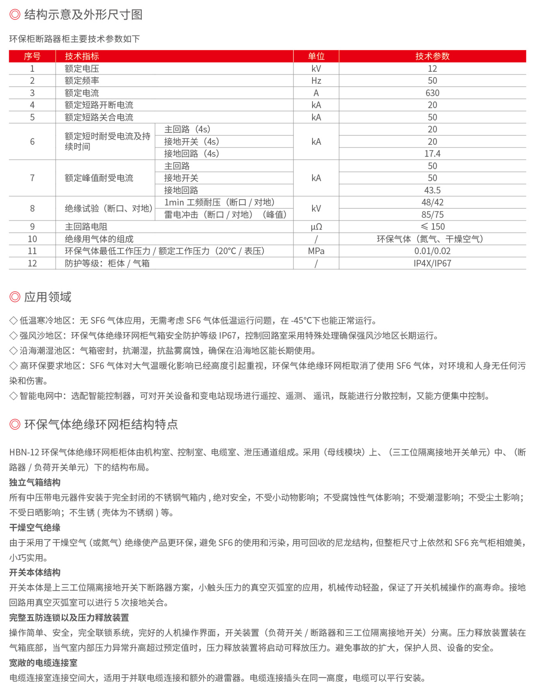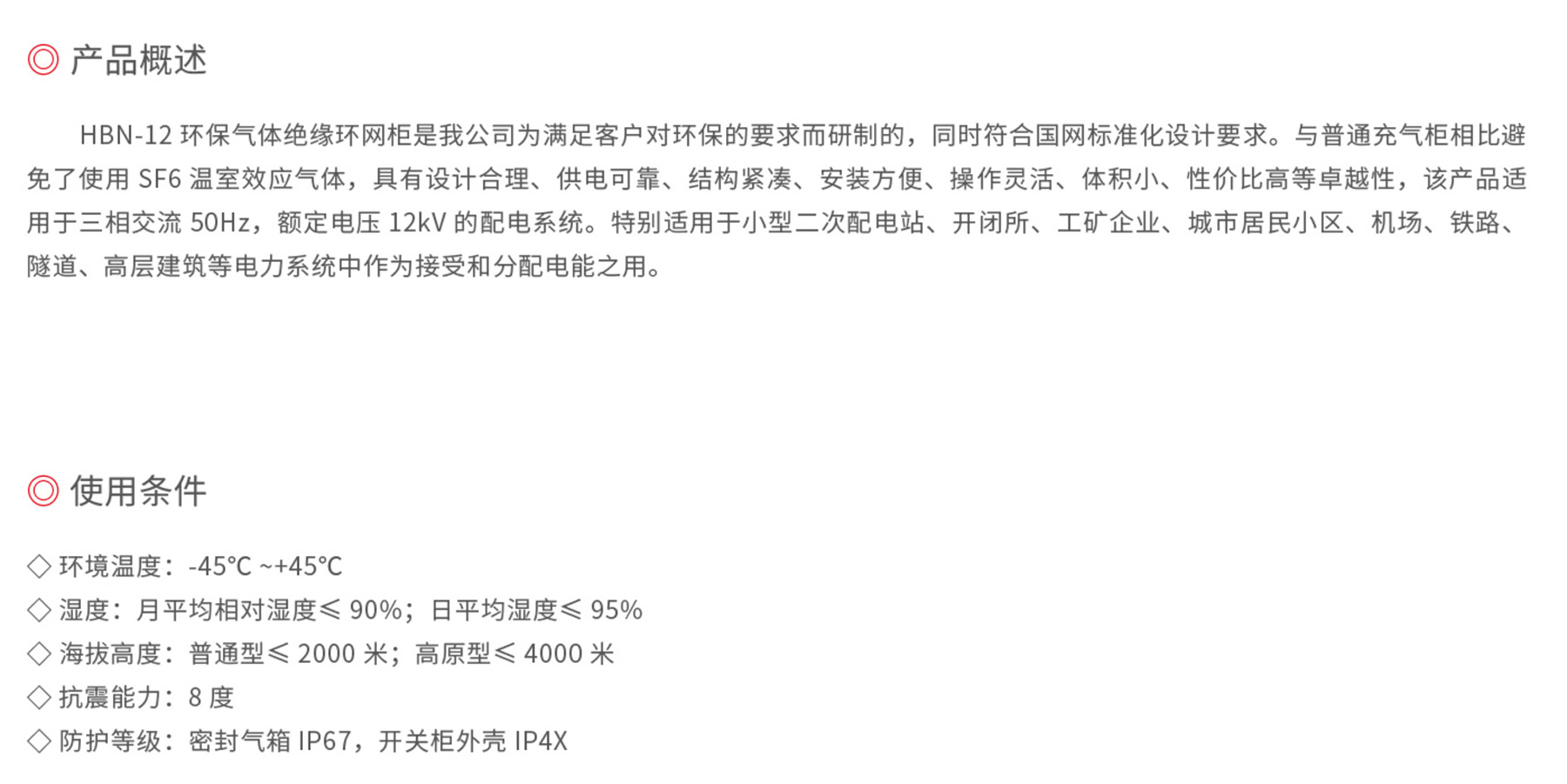 HBN-12環(huán)保氣體絕緣環(huán)網(wǎng)柜是我公司為滿足客戶對環(huán)保的要求而研制的,同時符合國網(wǎng)標準化設計要求。與普通充氣柜相比避免了使用SF6溫室效應氣體,具有設計合理、供電可靠、結構緊湊、安裝方便、操作靈活、體積小、性價比高等卓越性,該產(chǎn)品適用于三相交流50Hz,額定電壓12kV的配電系統(tǒng)。特別適用于小型二次配電站、開閉所、工礦企業(yè)、城市居民小區(qū)、機場、鐵路、隧道、高層建筑等電力系統(tǒng)中作為接受和分配電能之用。