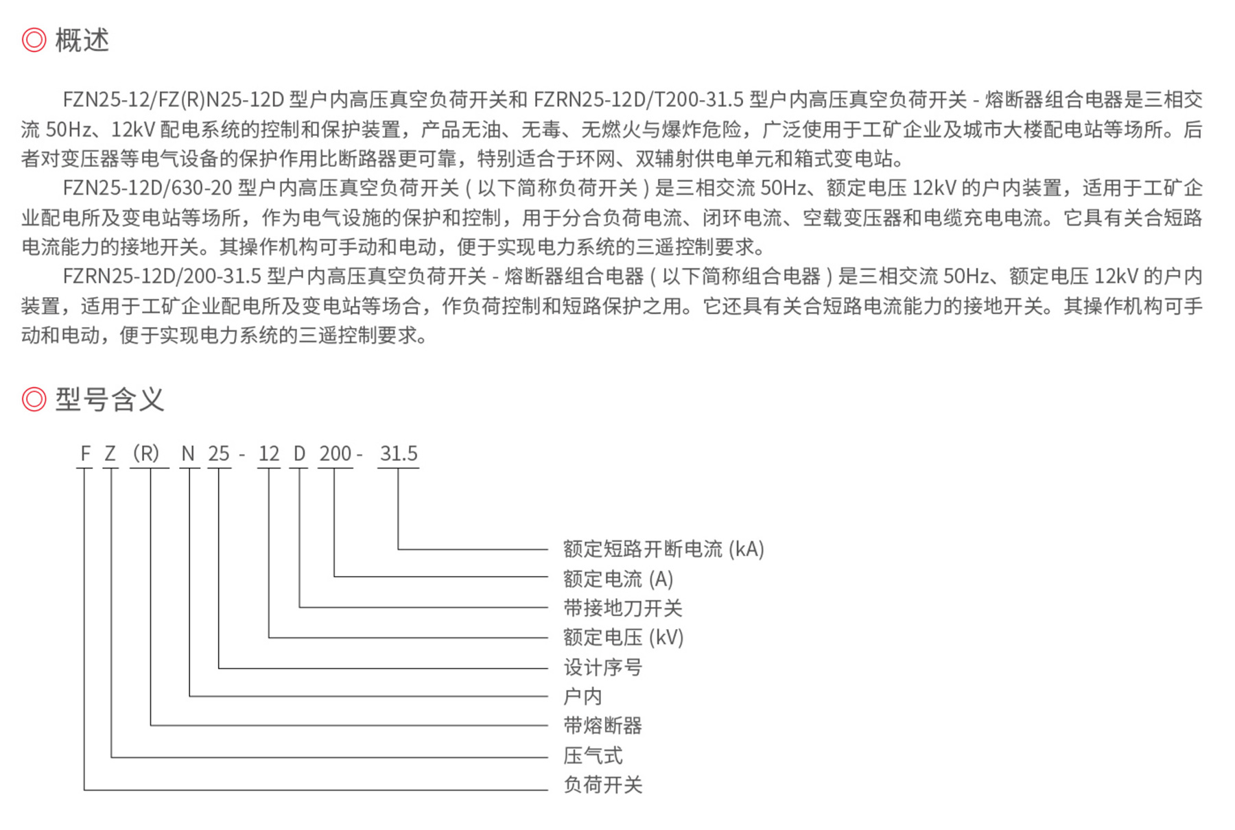 FZN25-12/FZ(R)N25-12D型戶內(nèi)高壓真空負(fù)荷開關(guān)和FZRN25-12D/T200-31.5型戶內(nèi)高壓真空負(fù)荷開關(guān)-熔斷器組合電器是三相交流50Hz、12kV配電系統(tǒng)的控制和保護(hù)裝置,產(chǎn)品無油、無毒、無燃火與爆炸危險,廣泛使用于工礦企業(yè)及城市大樓配電站等場所。后者對變壓器等電氣設(shè)備的保護(hù)作用比斷路器更可靠,特別適合于環(huán)網(wǎng)、雙輔射供電單元和箱式變電站。