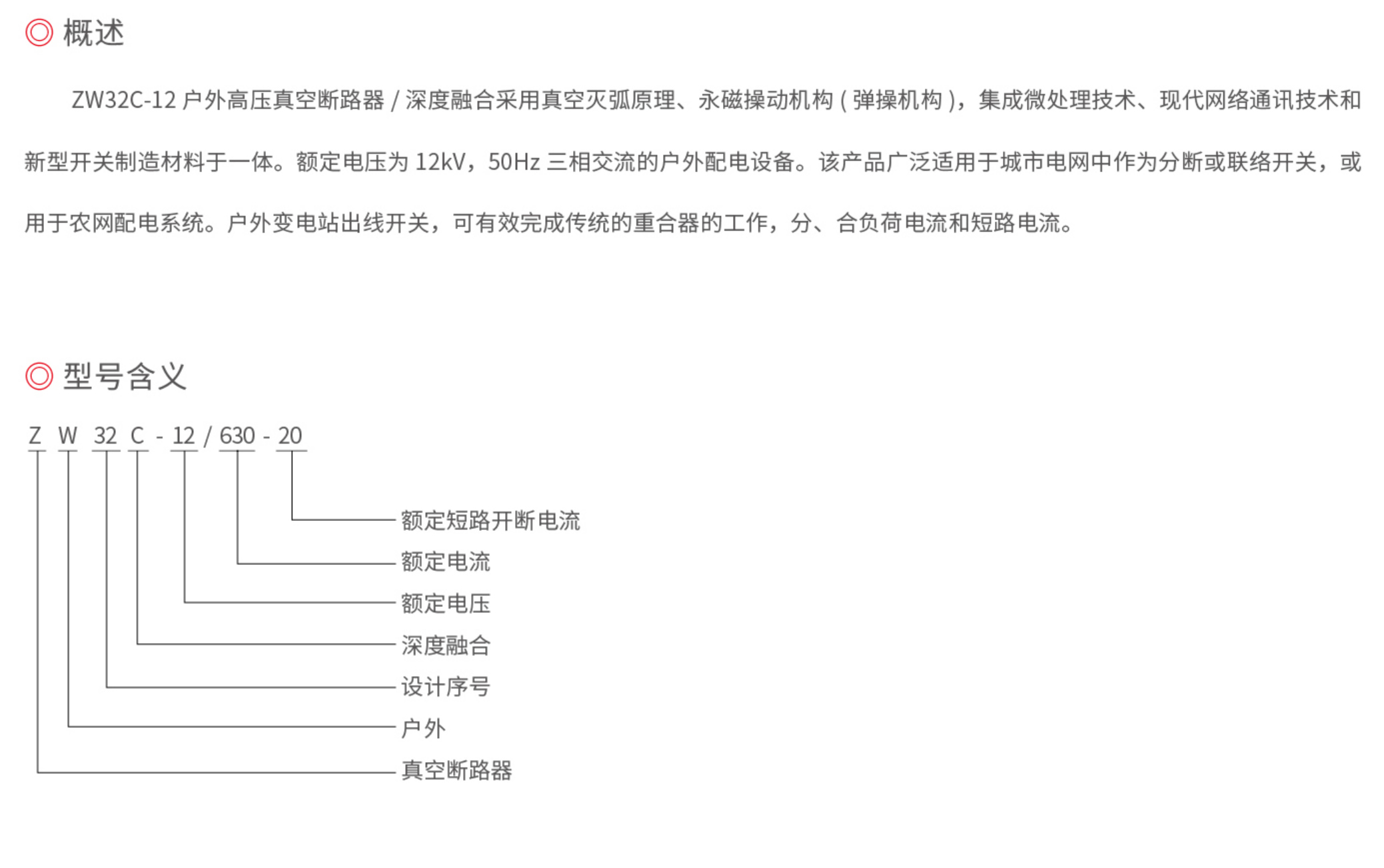 ZW32C-12 Outdoor high voltage vacuum circuit breaker/deep fusion uses vacuum arc extinguishing principle, permanent magnet operating mechanism (bomb operating mechanism), integrated micro-processing technology, modern network communication technology and new switch manufacturing materials in one. The rated voltage is 12kV,50Hz three-phase AC outdoor distribution equipment. The product is widely used in urban power grid as a break or contact switch, or used in rural power distribution system. The outdoor substation outlet switch can effectively complete the work of the traditional recloser, dividing and combining the load current and short circuit current.