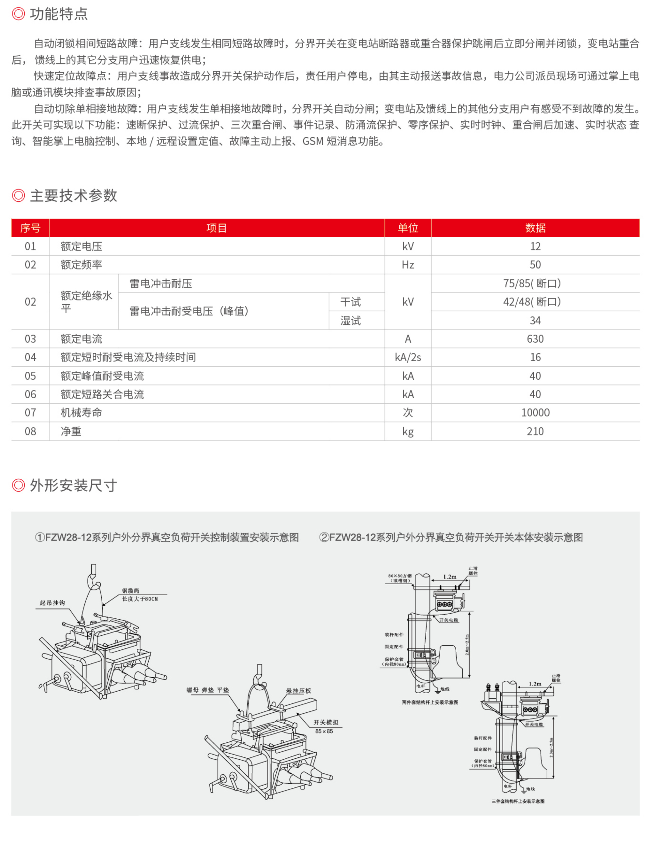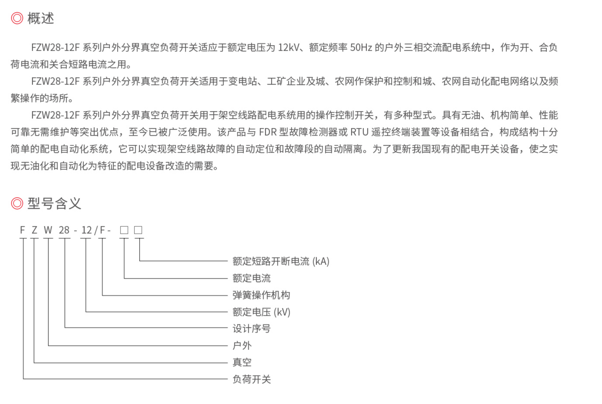 FZW28-12F series outdoor demarcation vacuum load switch is suitable for outdoor three-phase AC power distribution system with rated voltage of 12kV and rated frequency of 50Hz, and is used for opening and closing load current and short circuit current.